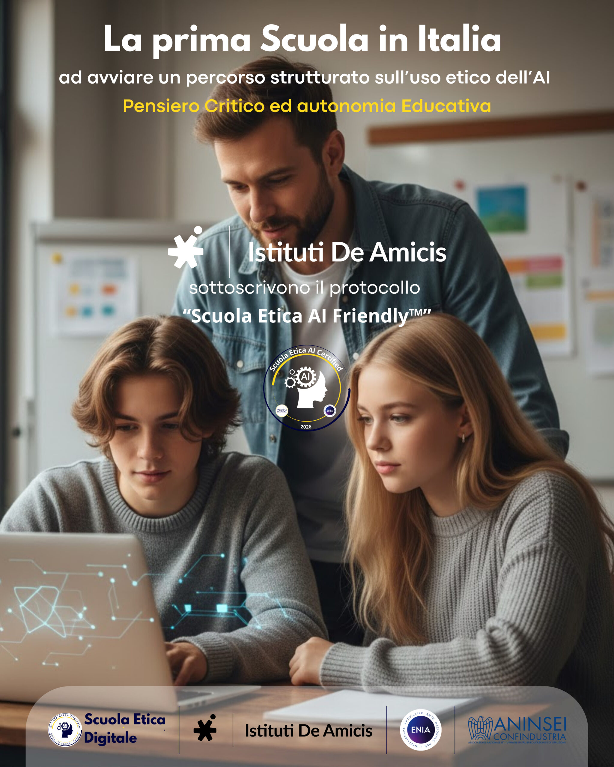 Scuola Etica Digitale, Istituti De Amicis ENIA annunciano la sottoscrizione di un protocollo di intenti finalizzato all’avvio del percorso di certificazione degli Istituti De Amicis come “Scuola Etica AI Friendly”.